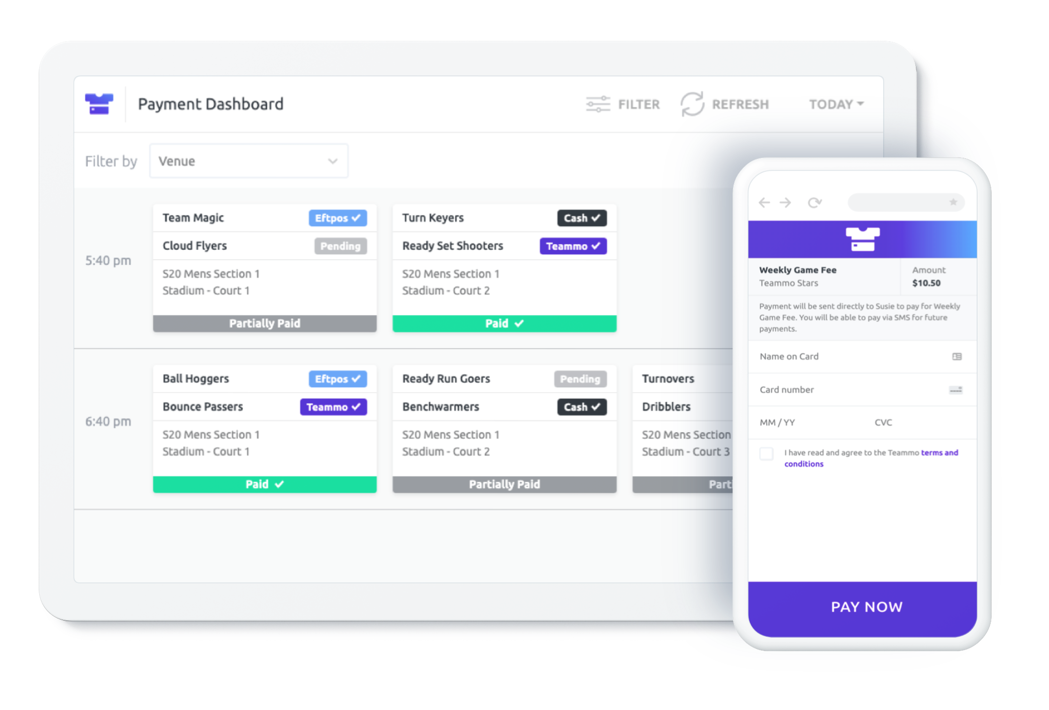 Teammo provides a dashboard for team organisers, clubs and associations to see payments requested and received.